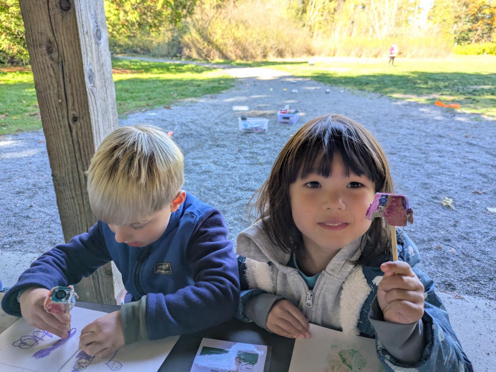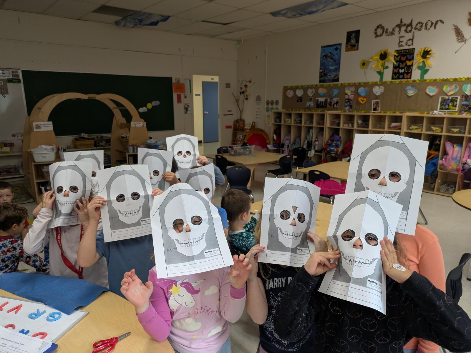 I hope you enjoyed the hazelnuts! Kindergarten students counted groups of 10 and their Gr. 6/7 buddies tallied them all up. We picked a total of 1,529 nuts! I tried making Nutella with mine. It definitely tasted good but not as smooth as store-bought! Here are some of the week’s highlights: sunning snakes, mushrooms both wild and crafty, apple critter and skulls. This is a very crafty bunch of kids and they love to be busy making things.